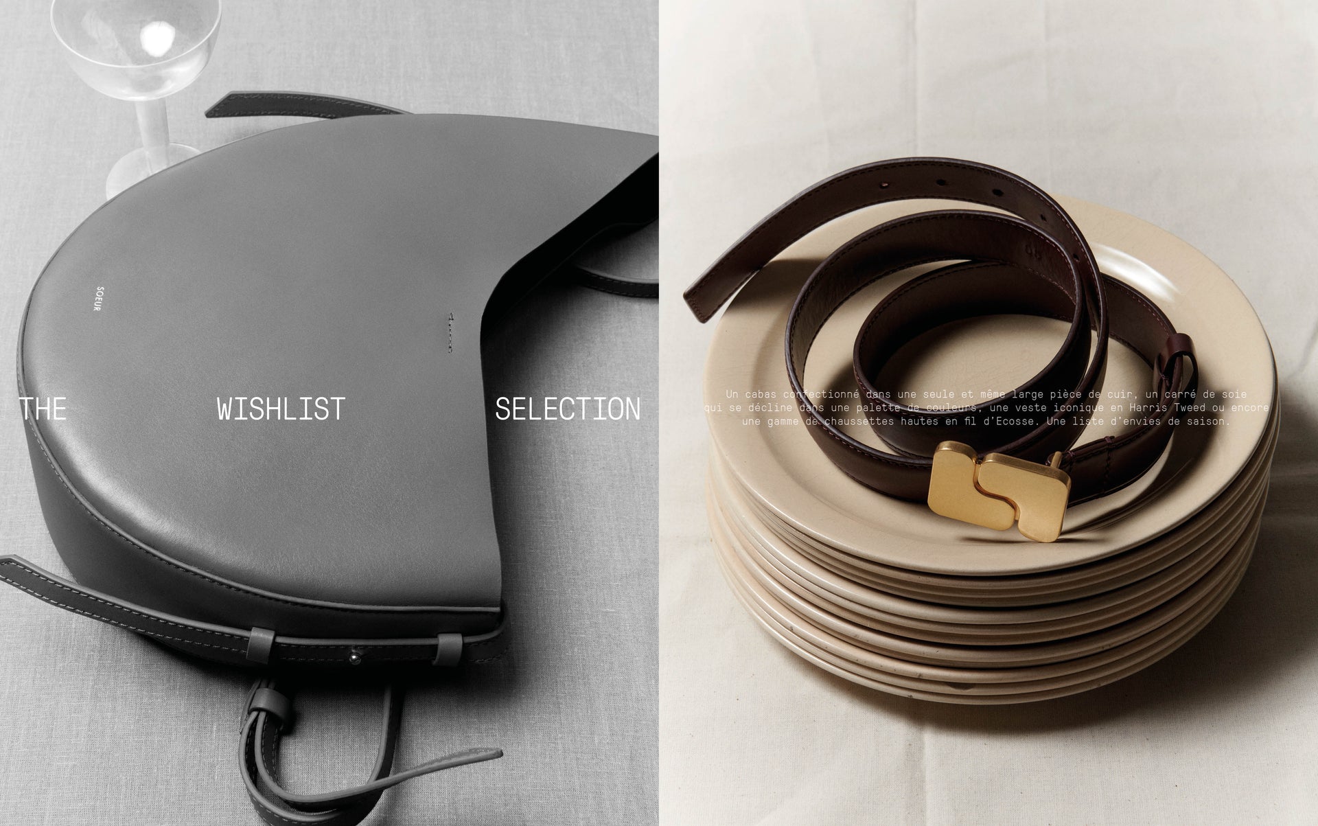 A bag crafted in a single large piece of leather, a silk square available in a palette of colors, an iconic jacket in Harris Tweed, and a range of long socks in mercerized cotton thread.