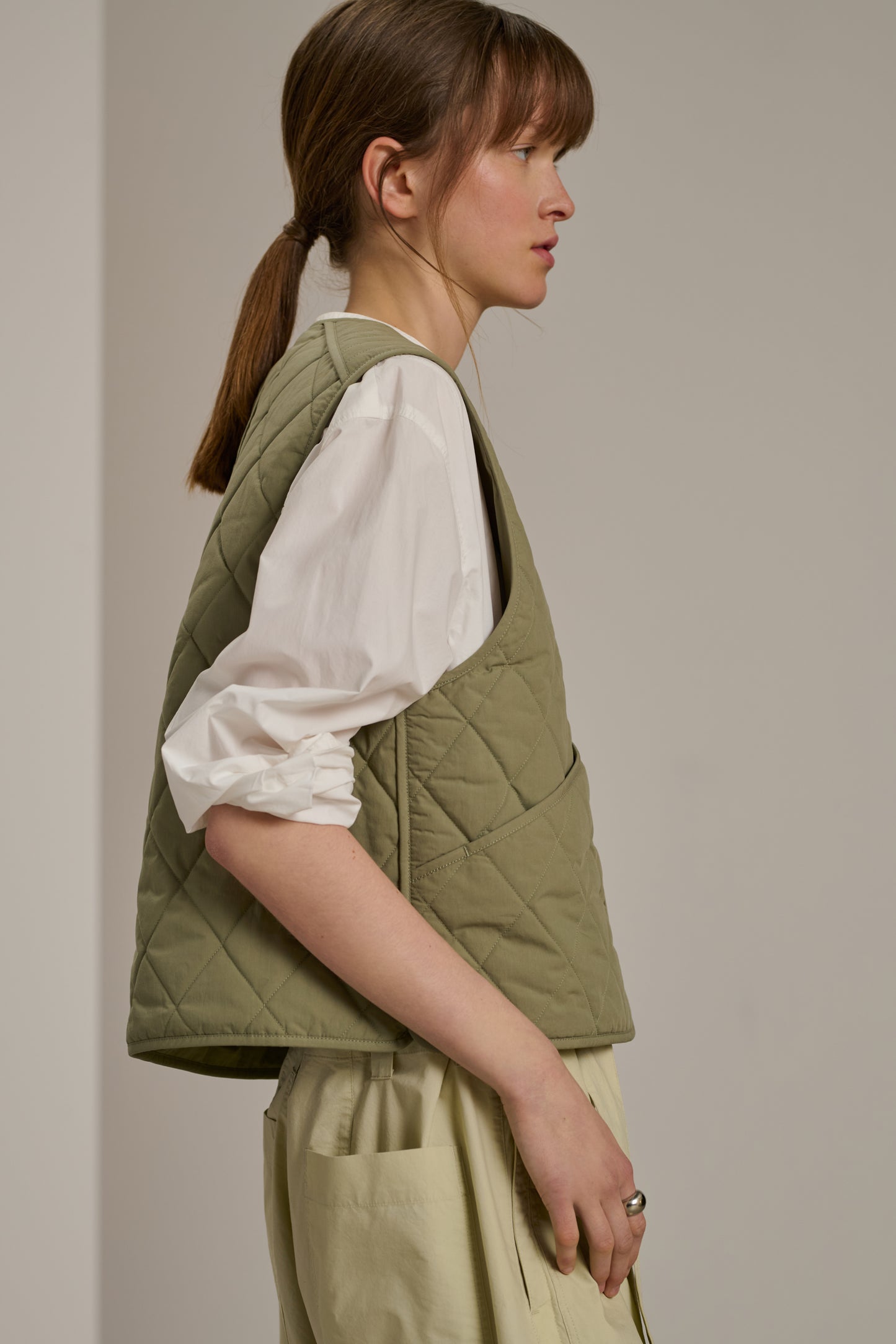 ULLA is a quilted cotton vest that can be layered as desired. It's lightly padded yet thin enough to be worn under a coat without hindering movement. Piping details accentuate the shoulders, patch pockets, and button placket.