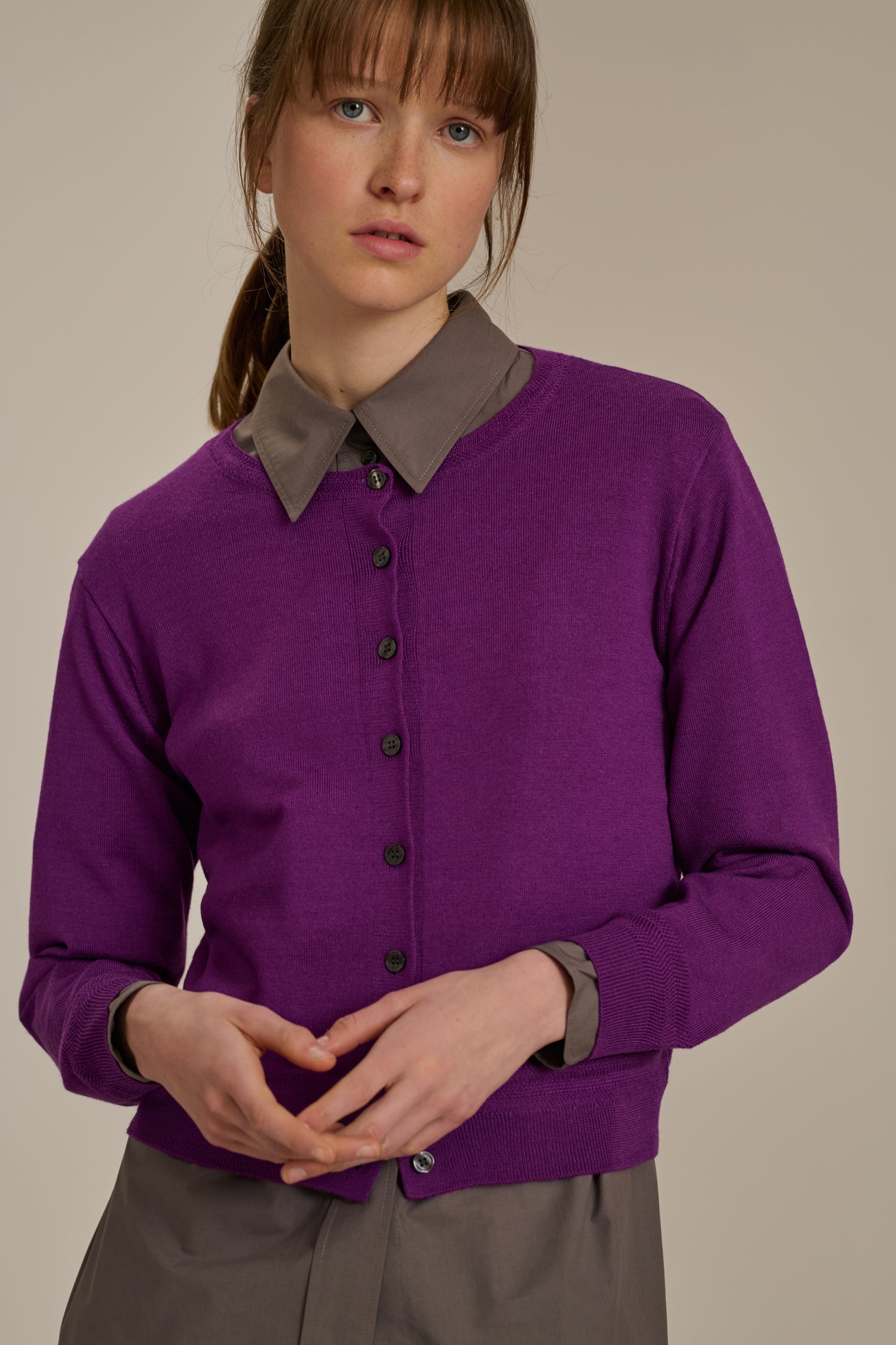 TITA is a short, boxy cardigan. It's knitted from fine merino wool, soft enough to wear against the skin or layered over other pieces. The sleeves and hemline feature a textured stitch that adds a unique touch. It pairs beautifully with high-waisted jeans or a sleek skirt.